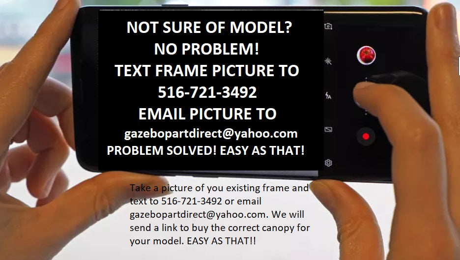If you do not see your gazebo or need us to determine model (text frame picture ) or have a question . Please contact us at gazebopartdirect@yahoo.com or call or Text 516-721-3492. We are always here to help.