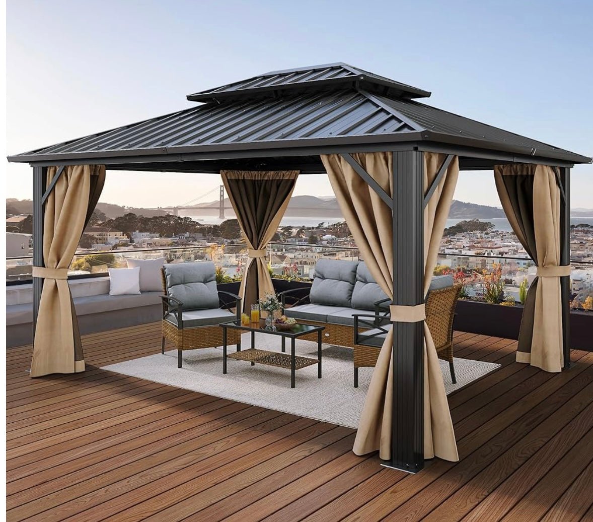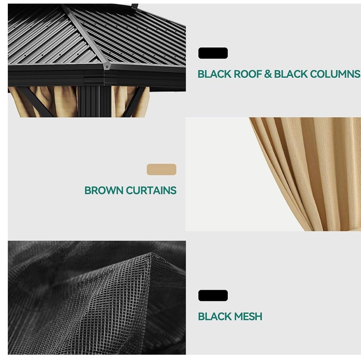 10x12ft Gazebo Hardtop Double Roof Canopy w/Netting and Curtains, Outdoor Gazebo 2-Tier Galvanized Iron Aluminum Frame Garden Tent for Patio, Backyard, Deck and Lawns, Brown
