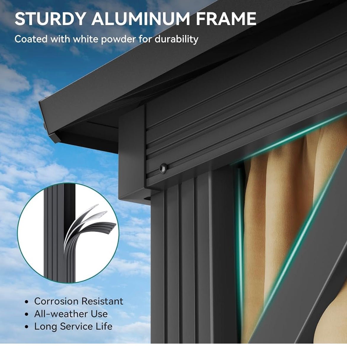 - STURDY ALUMINUM FRAME- Strong powder coated black aluminum frame, resistant to fading, rust and corrosion, durable materials, easy to assemble and disassemble, support all-weather use. Feet with holes and ground stakes for added stability, 4 corners reinforced for extra durability and safety
