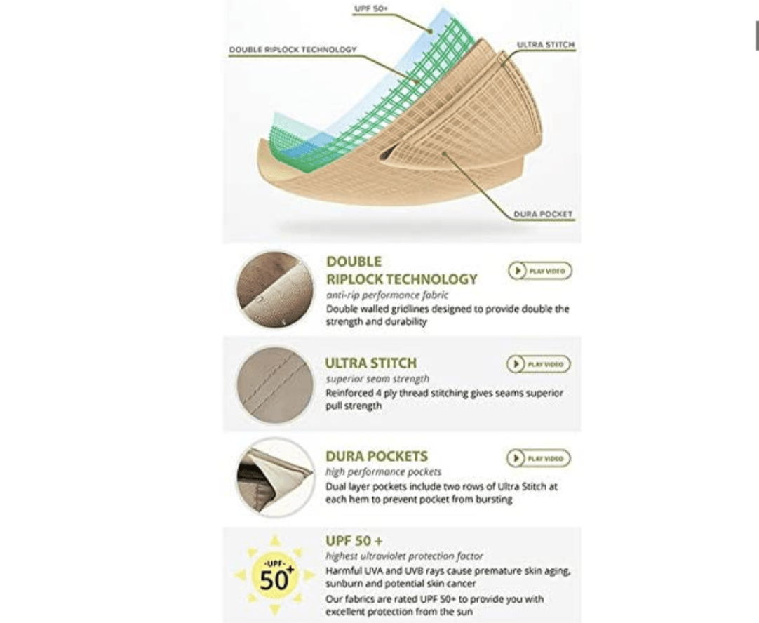 - UPF 50+, water resistant, CPAI-84 fire retardant