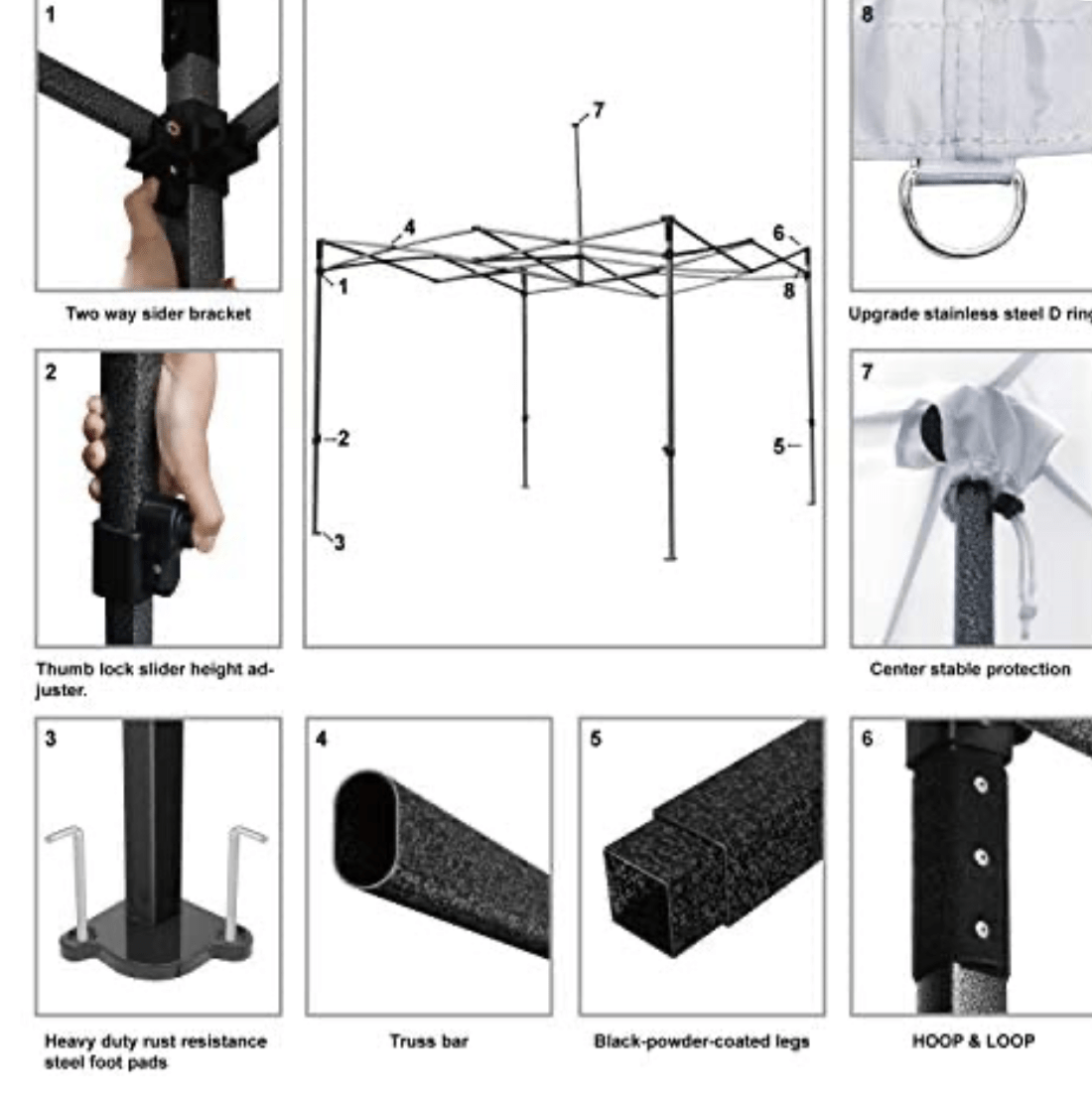 - BEST QUALITY OF FRAME AND FABRIC-The durable black-powder-coated steel, non-rust frame has nylon plastic connection hardware. Beautiful, strong and security. The latest thumb lock system, easy to lock and release. The canopy top is 500D high-strength fabric with PU lining, blocking 99% of the sun's harmful rays. Stitching lines are all seam sealed to prevent water penetrate from seams to make our canopy tent waterproof.