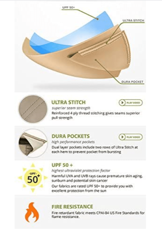 - UPF 50+, water resistant, CPAI-84 fire retardant