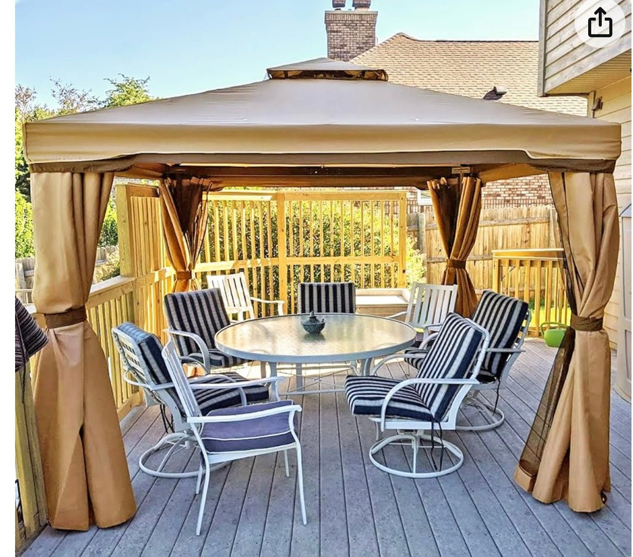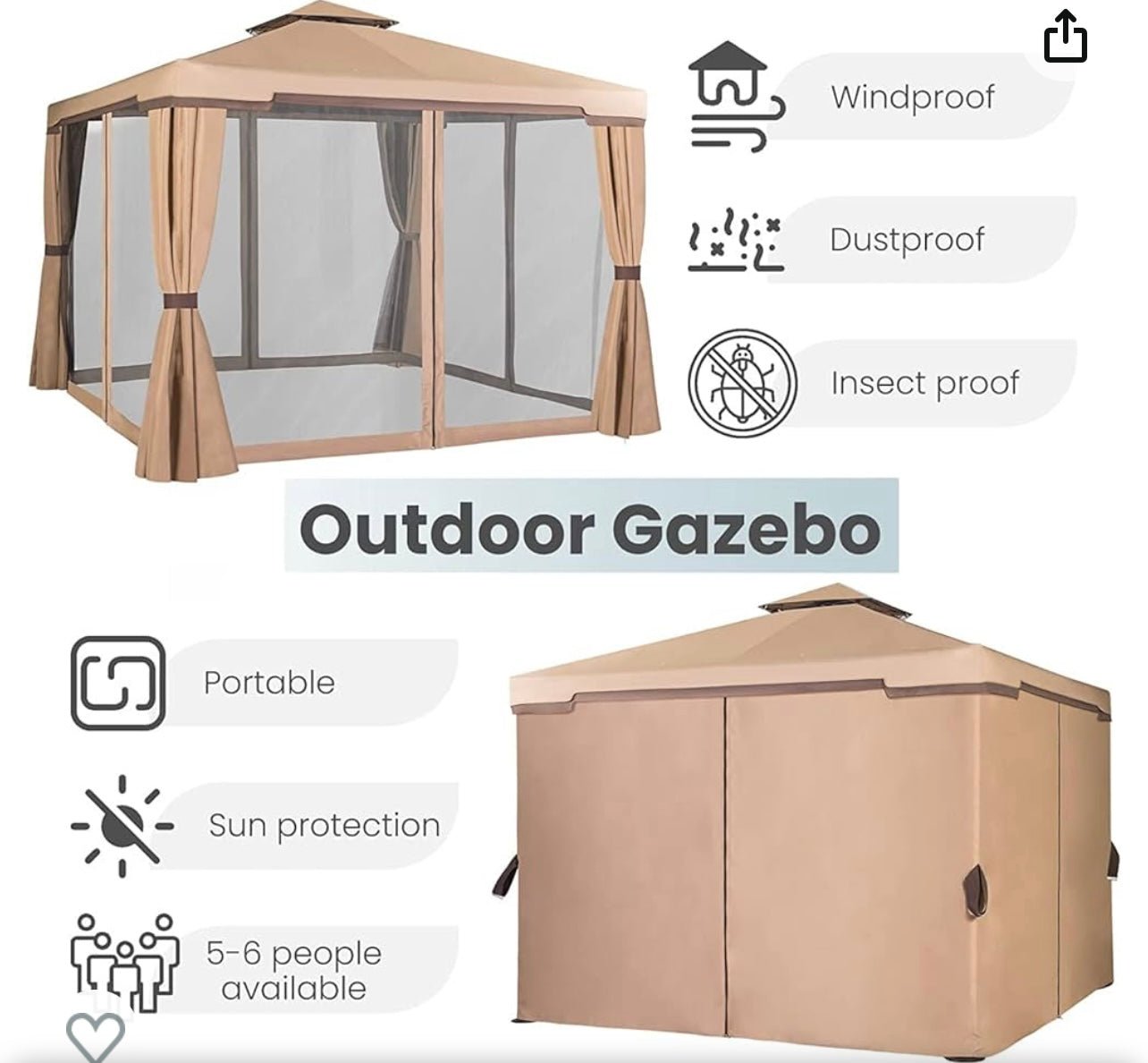 10 x 10 FT Outdoor Gazebo for Patio Iron Frame Garden Permanent Gazebo with Vented Soft Canopy and Mosquito Netting, Khaki