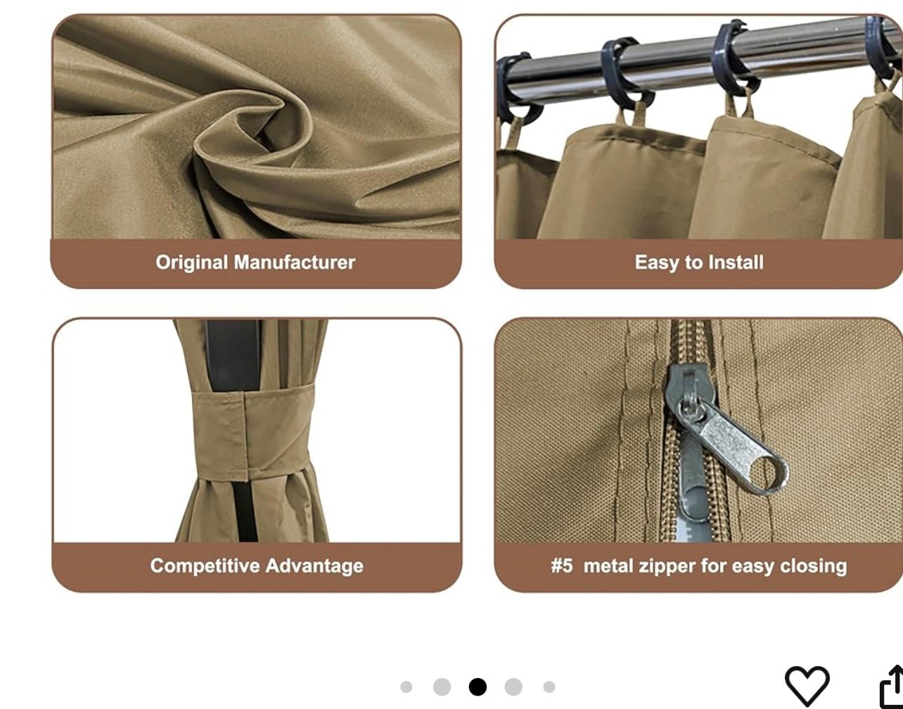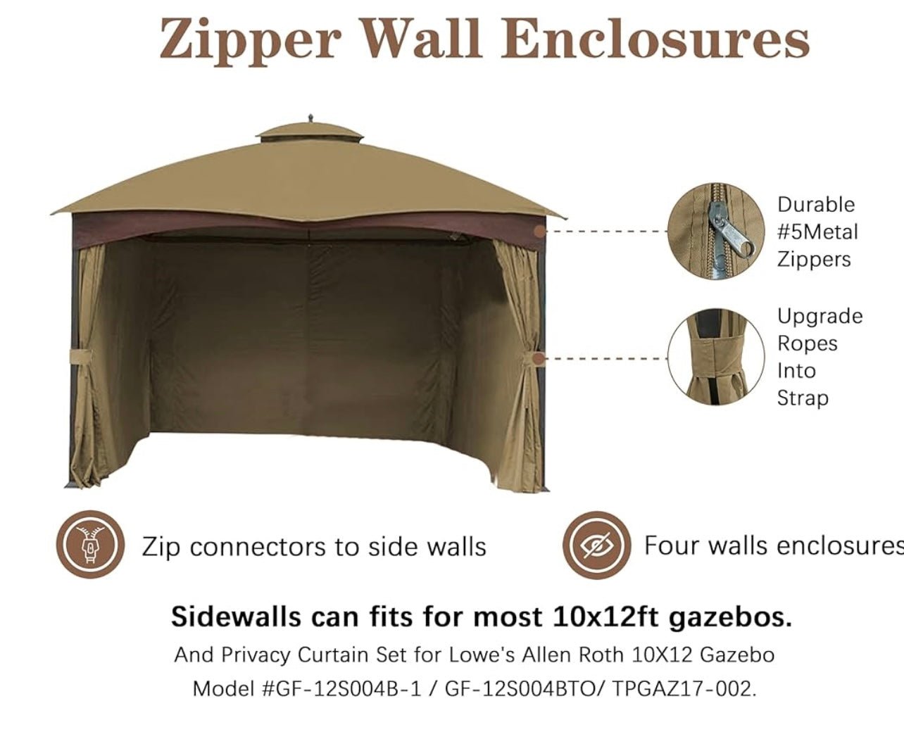 Design to use with Lowe's Allen Roth 12-ft L x 10-ft W gazebo 355094 & 510327.GF12S004B, GF12S004B1 The curtains can also fit all 10' x 12' gazebos. 100% polyester, UV- protected, water-repellent. CPAI-84 US Standard fire- retardant fabric. Privacy curtains ONLY. Not including canopy and metal models. Curtains for four walls of gazebo enclosure. Zippers in center of each side allows for easy entry and exit. Full-length provide more privacy and protection from sun and winds.. Dimensions: 12' x 10' x 7'. Please do the measurements of your gazebo and make sure that our product will fit it. Quality you can trust from the original manufacturer. Clip Rings/Hangers and Replacement "J" Hooks sold separately IN OUR STORE